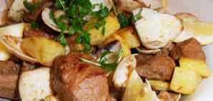 Sautéed Pork with Clams / Carne de Porco a AlentejanaIt is typical from the Alentejo region, in Portugal, hence the word Alentejana (from Alentejo) in its name. The pork is marinated in white wine, paprika and herbs; then fried until golden brown. To finish off this fantastic dish the pork is topped with clams and served in white wine, tomato and herb sauce. Some people refer to this dish as the Portuguese Surf n' Turf. Surely one not to be missed out on.